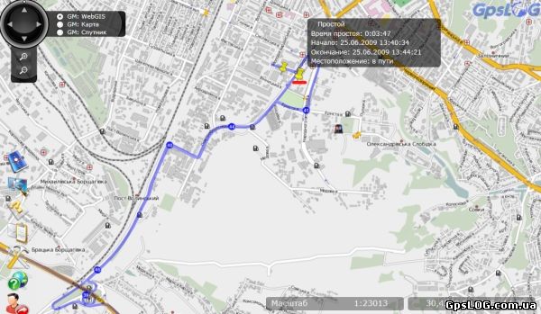 Во время просмотра трека движения транспортного средства на карте система GpsLOG предоставляет Вам информацию об остановках и стоянках автомобиля на протяжении всего маршрута с указанием продолжительности остановки и другой информации.